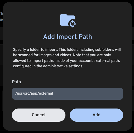 This guide walks you through adding an External Library. This guide assumes you are running Immich in Docker and that the files you wish to access are stored in a directory on the same machine.